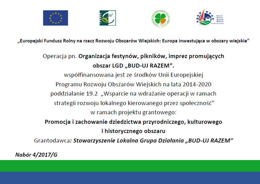 Stowarzyszenie Lokalna Grupa Działania „BUD-UJ RAZEM” realizuje projekt grantowy: Promocja i zachowanie dziedzictwa przyrodniczego, kulturowego i historycznego obszaru w ramach naboru 4/2017/G