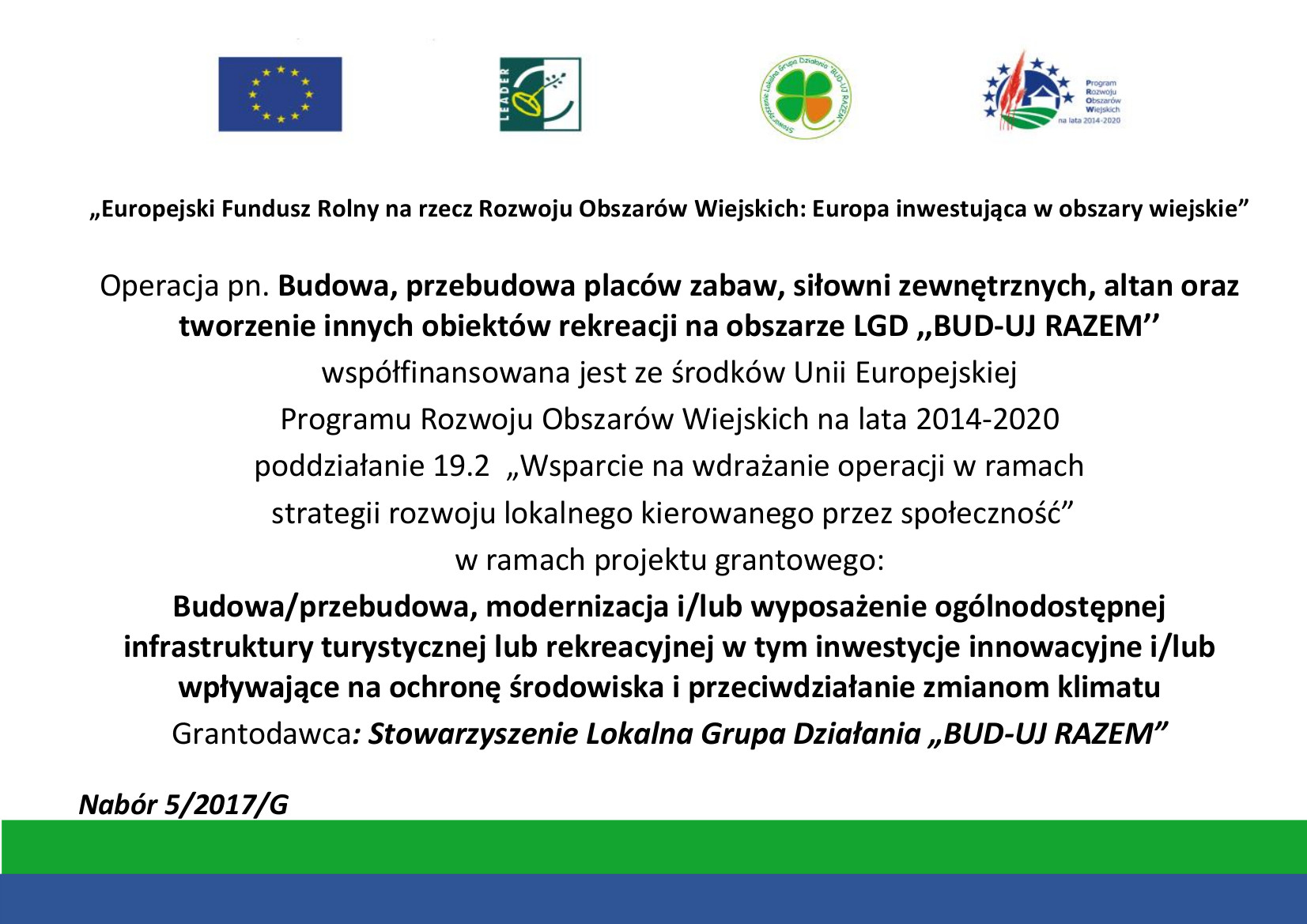 Stowarzyszenie Lokalna Grupa Działania „BUD-UJ RAZEM” realizuje projekt grantowy: Budowa/przebudowa, modernizacja i/lub wyposażenie ogólnodostępnej infrastruktury turystycznej lub rekreacyjnej w tym inwestycje innowacyjne i/lub wpływające na ochronę środowiska i przeciwdziałanie zmianom klimatu w ramach naboru 5/2017/G